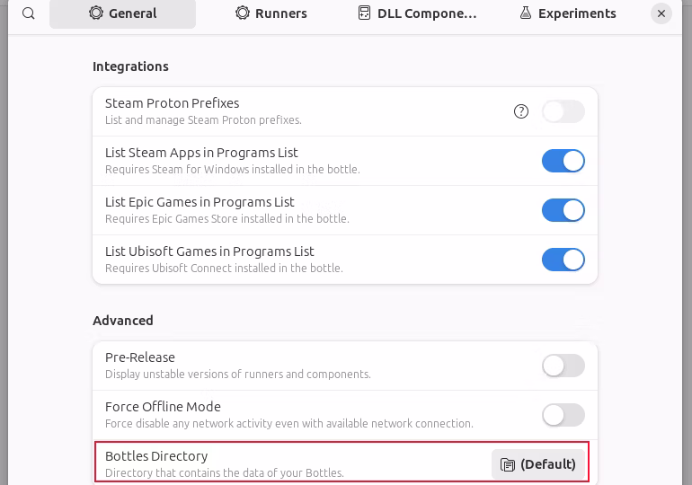 Bottles 有很多设置,您可以使用它们来微调 Bottles 的创建方式,以及 Bottles 内的应用程序可以使用哪些资源(例如运行时依赖项和 DLL)。