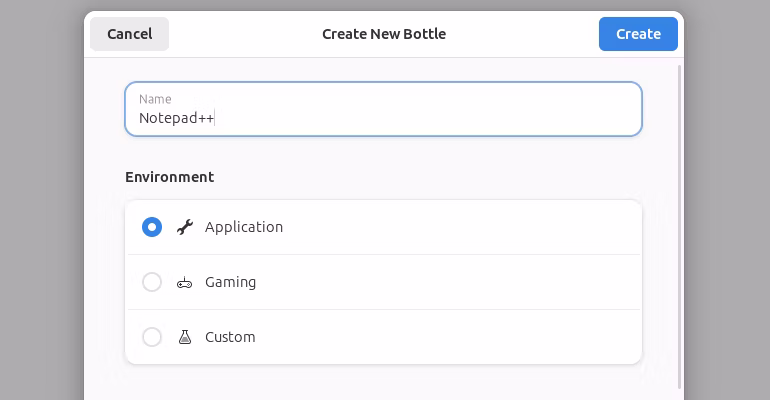 Bottles 提供了一个适合游戏的瓶子模板,以及另一个更适合一般应用的瓶子模板。它还提供了一个自定义瓶子模板,允许您自己配置您的瓶子。这也可用于运行 32 位软件。