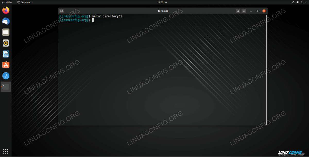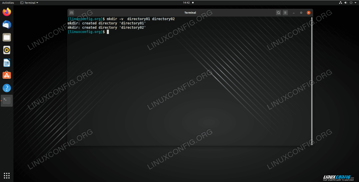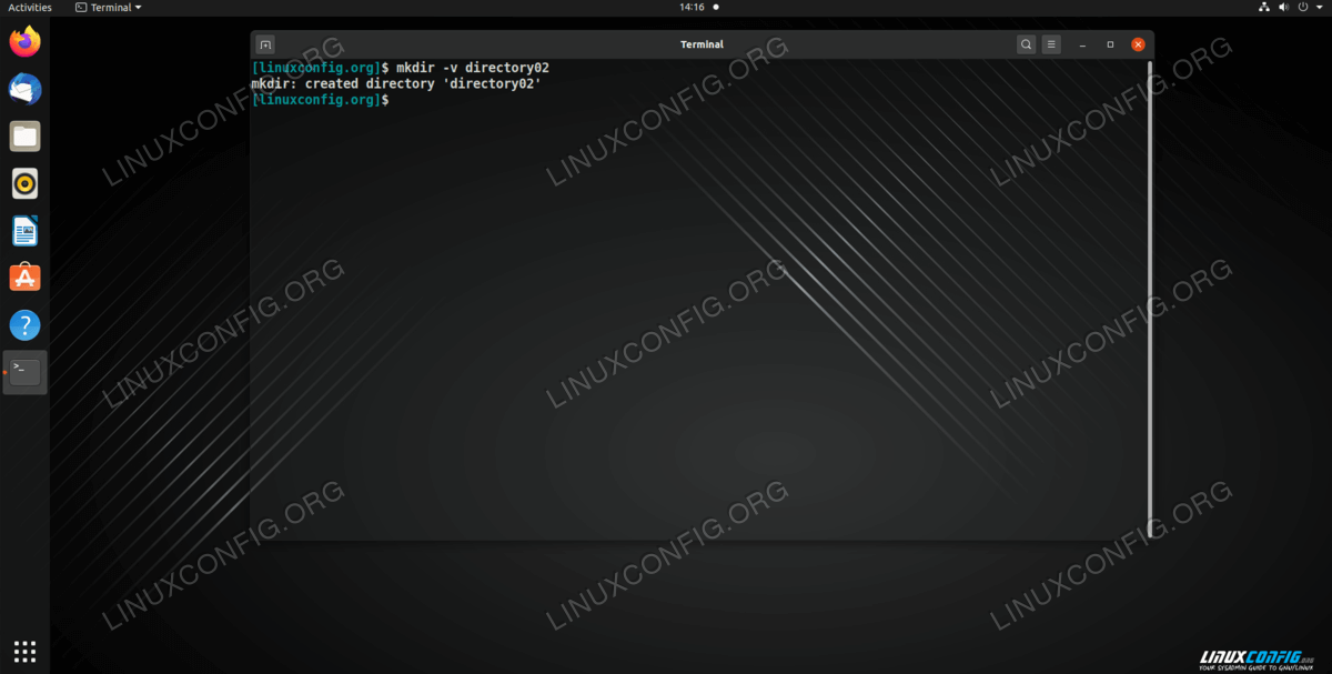 (详细)选项,我们可以获得mkdir命令来告诉我们它在后台做什么,以便我们可以看到它的运行情况。在下面的示例中,我们将向您展示如何在 Linux 终端中使用语法来获取此输出。$ mkdir -v directory02