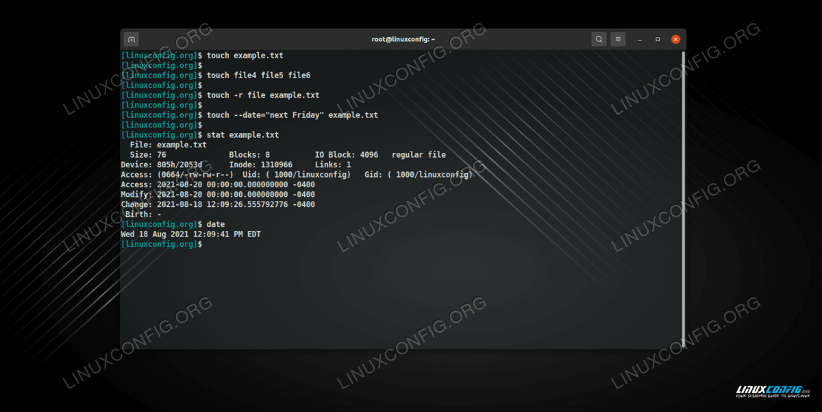 $ touch example.txt $ stat example.txt Access: 2021-08-16 22:59:27.315203013 -0400 Modify: 2021-08-16 22:59:27.315203013 -0400 Change: 2021-08-16 22:59:27.315203013 -0400