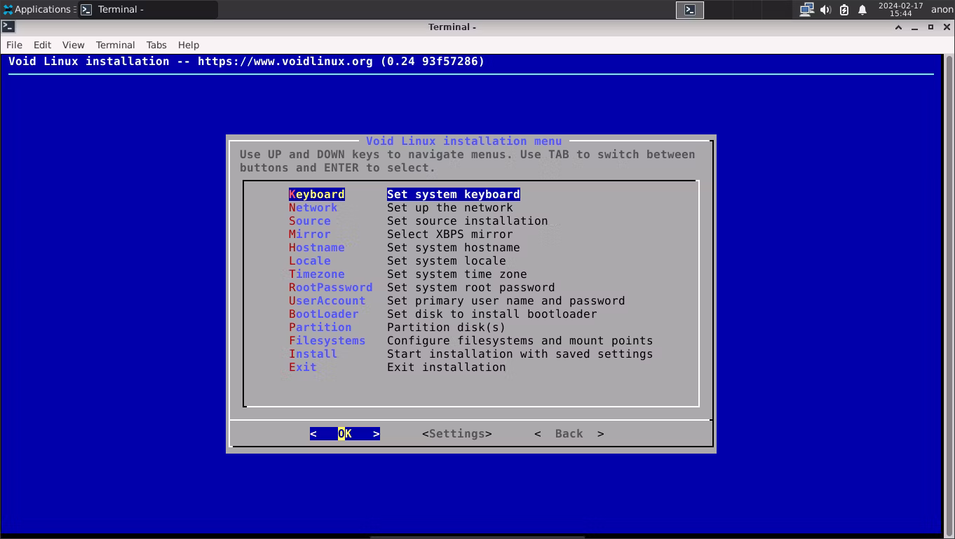 如果您想安装 Void,请打开终端并输入 sudo void-installer 以启动安装实用程序。这看起来像一个老式的安装程序,但过程相当简单。您需要使用箭头键选择每个选项,然后按 Enter 进行配置。