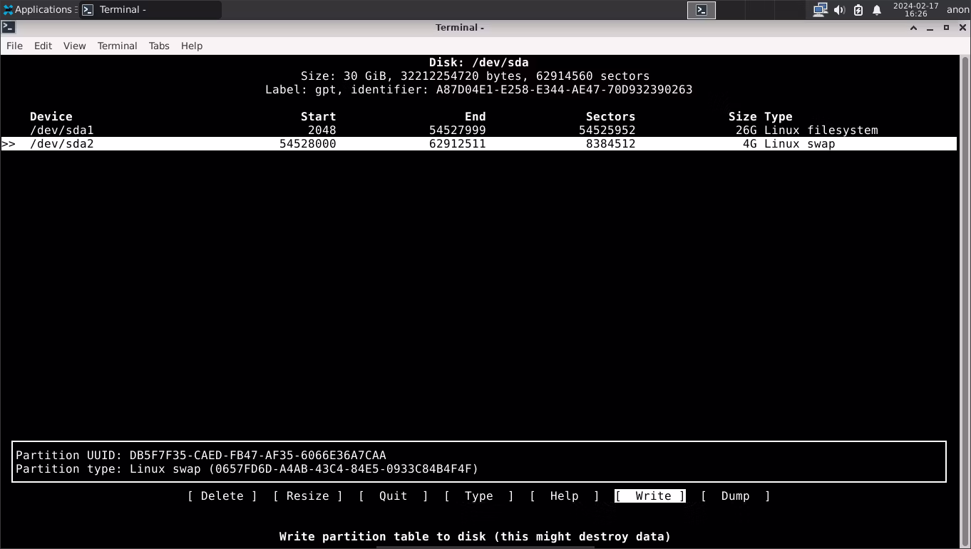 如果您使用的是 BIOS 系统,请选择“mbr”作为分区表。如果您想要交换分区(我们推荐),请创建一个新分区并选择其大小(至少 4GB 是个好主意)。选择剩余可用空间,并用磁盘上的剩余空间(默认输入)创建一个新分区。现在,使用“类型” 选项将 交换分区更改为“Linux 交换” 并将剩余空间更改为“Linux 文件系统”。<磁盘分区完成后,选择“写入”, 键入“是”, 然后选择“退出”。