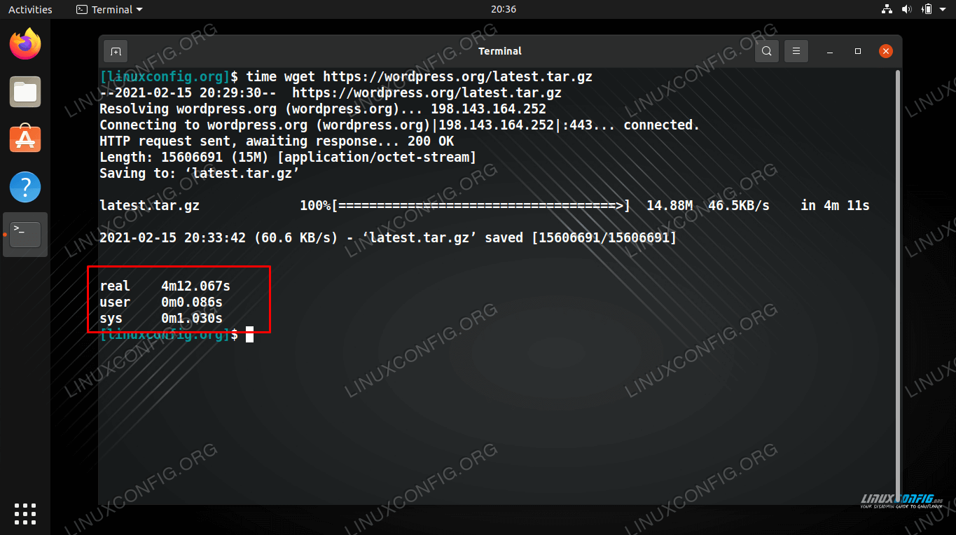 1. 如前所述,只需在任何命令前面添加 time 命令即可测量命令执行所需的时间。一个完美的例子是 wget 命令,它用于从 Internet 下载文件。使用time命令,我们可以有效地测量一个文件下载到我们的计算机上需要多长时间。