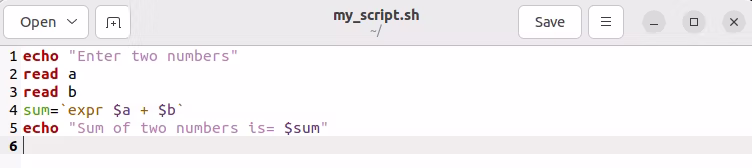例如,您可以创建一个使用 expr 命令将两个数字相加的脚本。首先,您需要创建一个扩展名为“.sh”的文件,例如“my_script.sh”。这告诉 shell 它是一个脚本文件。接下来,您需要编写一个代码,可以将两个数字作为输入并输出它们的总和。这是一个可以做到这一点的示例脚本: