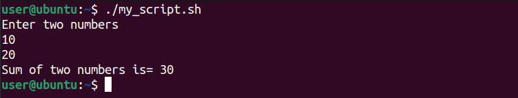 系统将提示您输入两个数字。输入数字后,您将看到脚本将在屏幕上显示两个数字的总和。您还可以根据需要修改脚本以执行其他操作或任务。