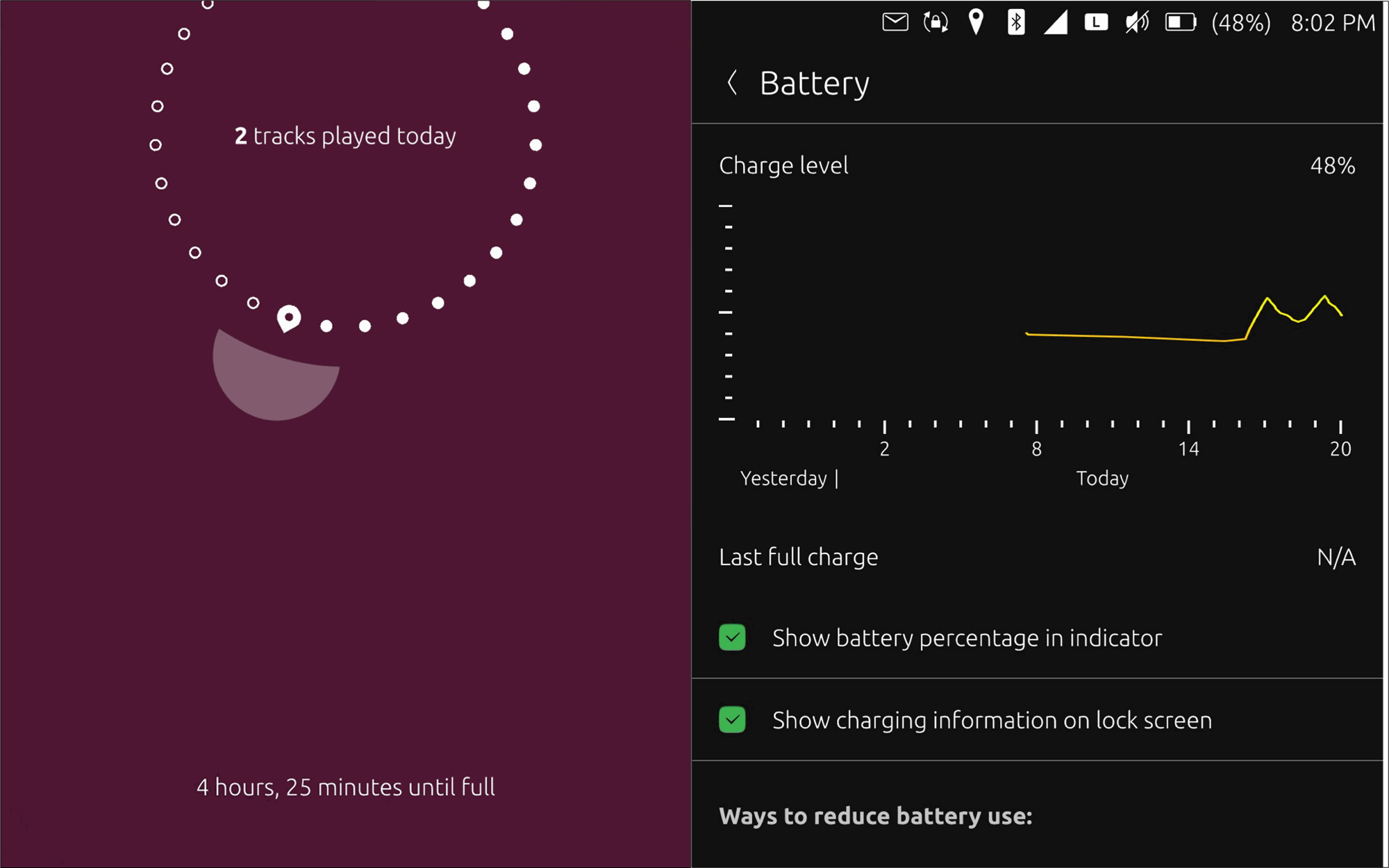 充电时间估计也在 Ubuntu Touch OTA-4 中首次亮相。插入手机后,您将在锁定屏幕底部看到剩余充电时间。现在可以从“背景和外观”设置面板激活 Ubuntu Touch 深色模式。深色模式以前需要第三方应用程序。