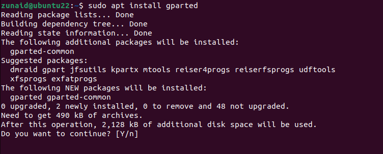 之后,通过运行以下命令在 Ubuntu 上安装 GParted: