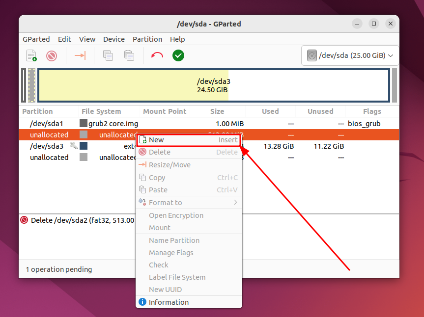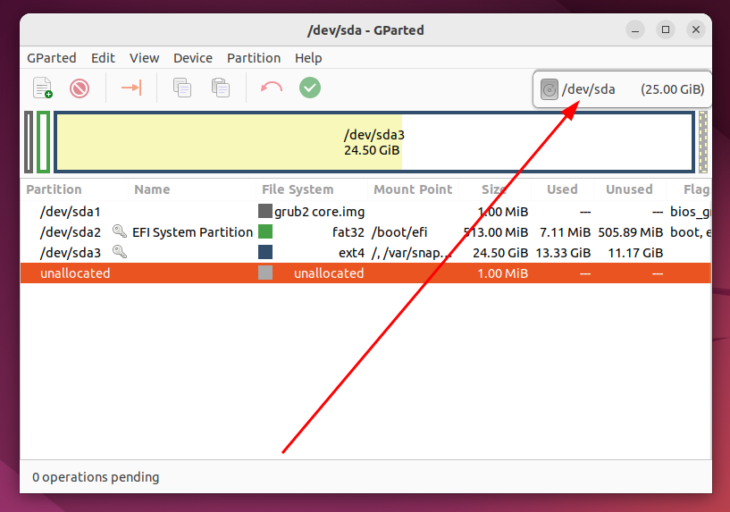 安装 GParted 后,您可以从应用程序菜单或终端启动它。由于您已经在终端上,请使用以下命令启动 GParted: