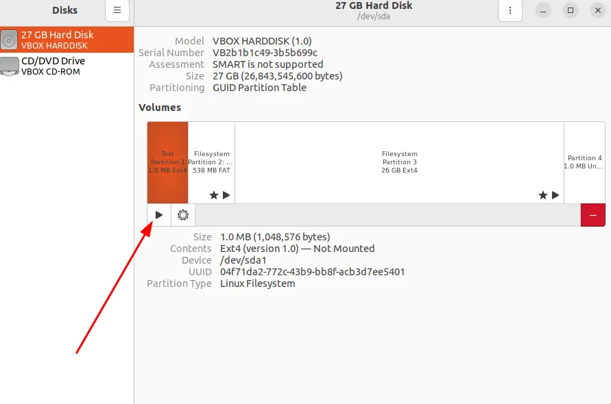 之后,您将返回到初始磁盘窗口。这次,您会注意到设置按钮旁边有一个三角形的播放按钮。单击它来挂载分区。