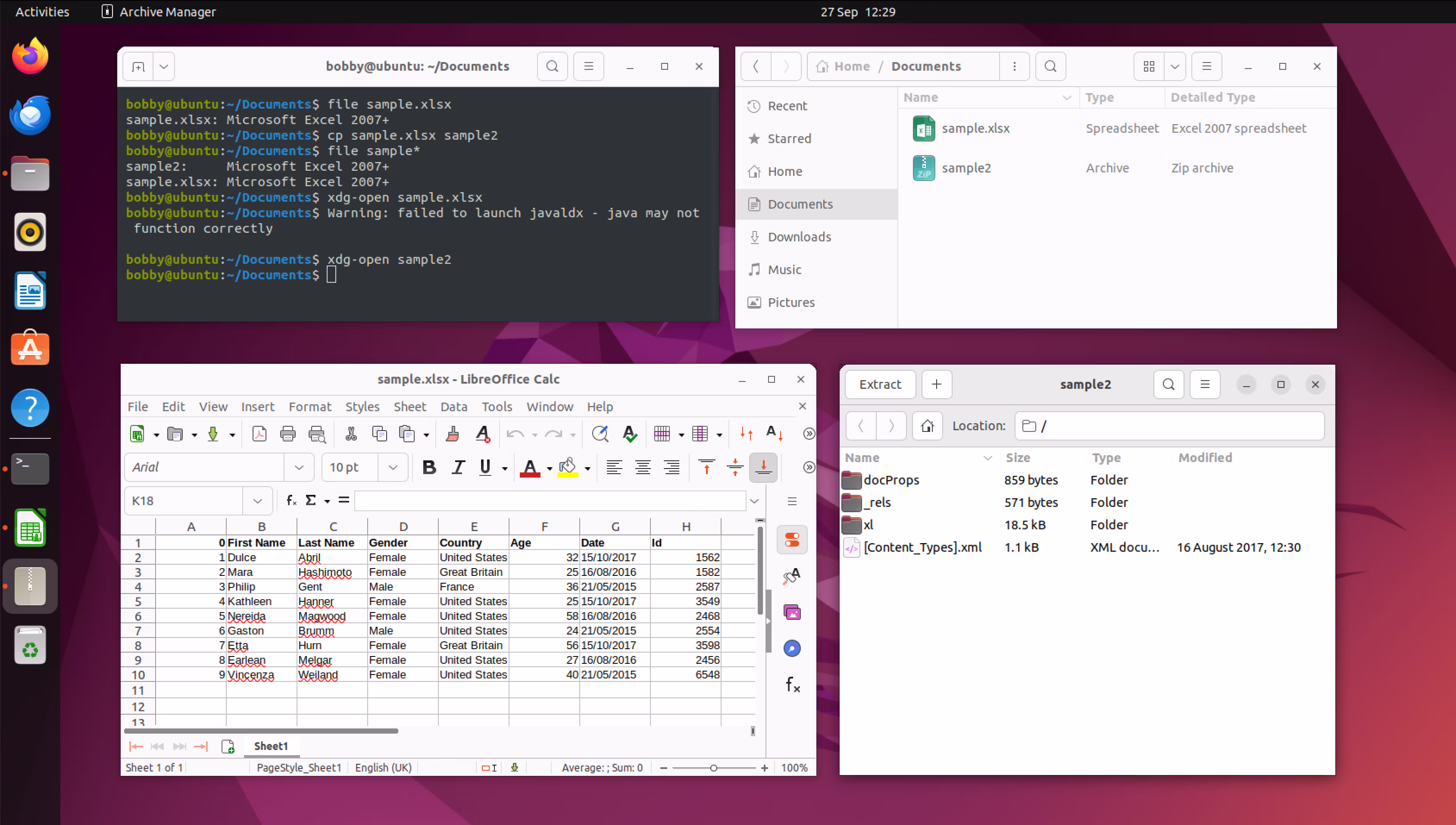 某些文件类型更加依赖扩展名。例如,XLSX 文件是一种压缩文件,因此扩展名很重要。没有它,像 xdg-open 这样的应用程序将无法达到您的预期。此示例使用名为sample.xlsx 的Excel 电子表格文件以及名为sample2 的该文件的副本(不带扩展名)。