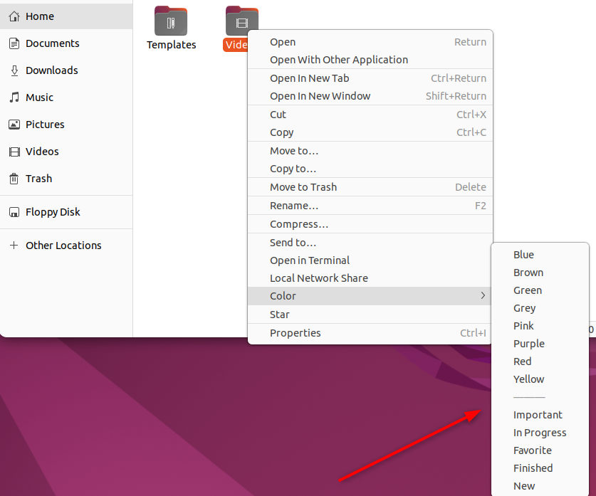 - 要更改文件夹颜色,请使用“sudo apt installfolder-color”命令安装“folder-color”实用程序。右键单击该文件夹并访问“文件夹颜色”设置。从那里,为您的文件夹选择合适的颜色或标志。