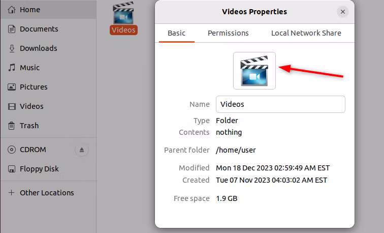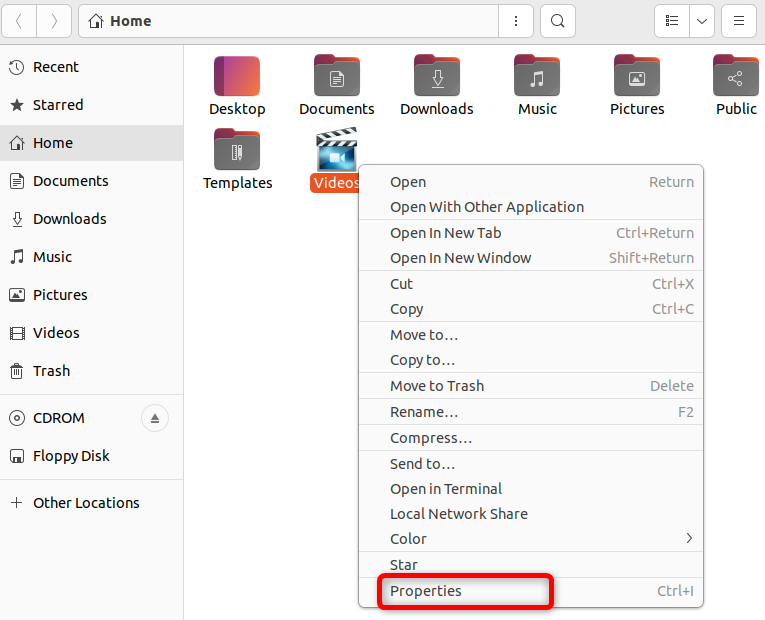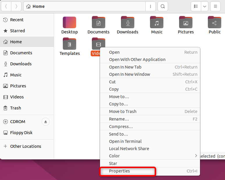现在,让我们选择之前修改的视频文件夹。要将其当前图标恢复为默认外观,请打开该文件夹的“属性”部分。您也可以按 Ctrl+i。