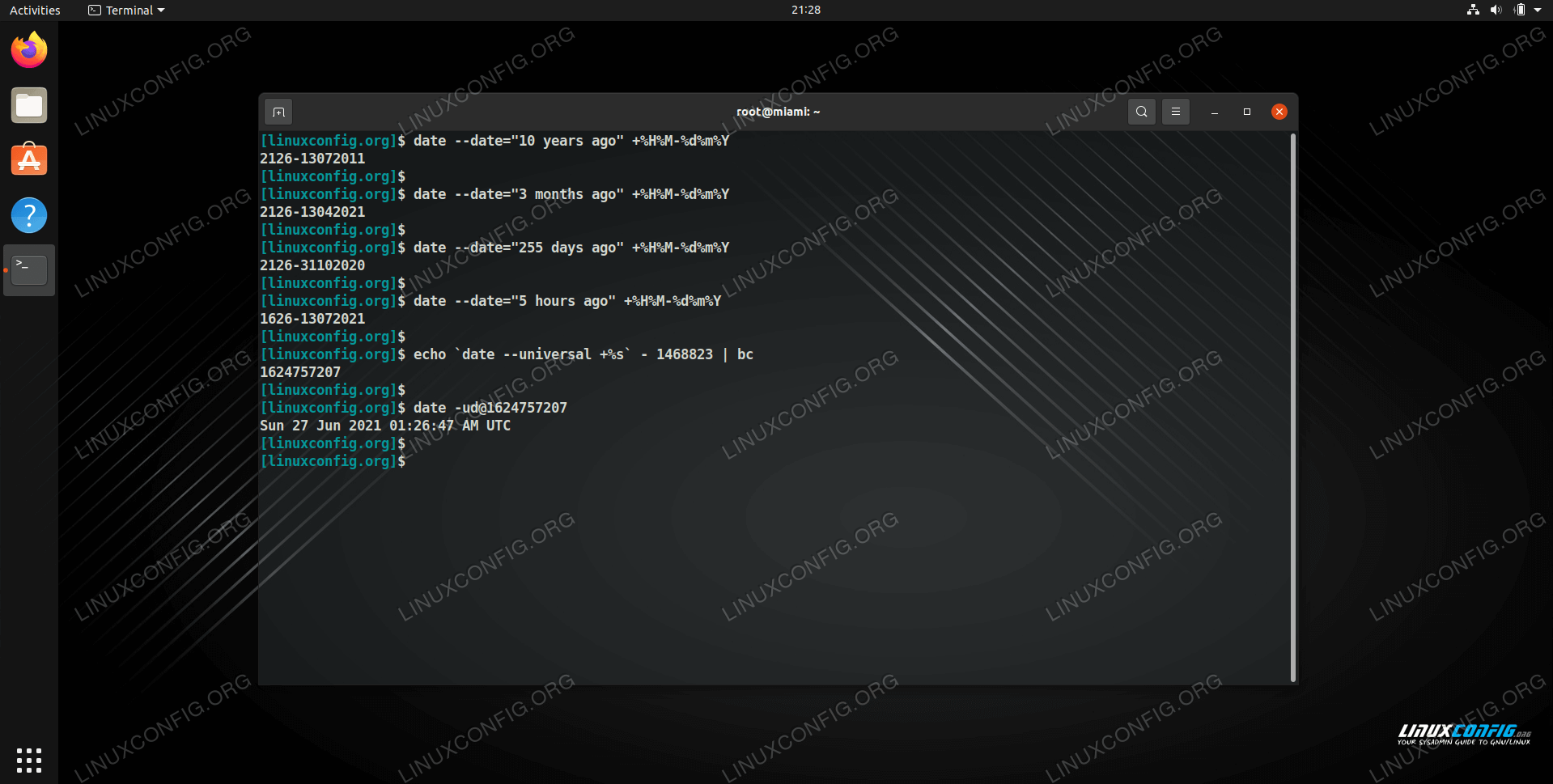 $ date Tue Jul 13 21:12:52 EDT 2021 $ date --date="10 years ago" +%H%M-%d%m%Y 2112-13072011