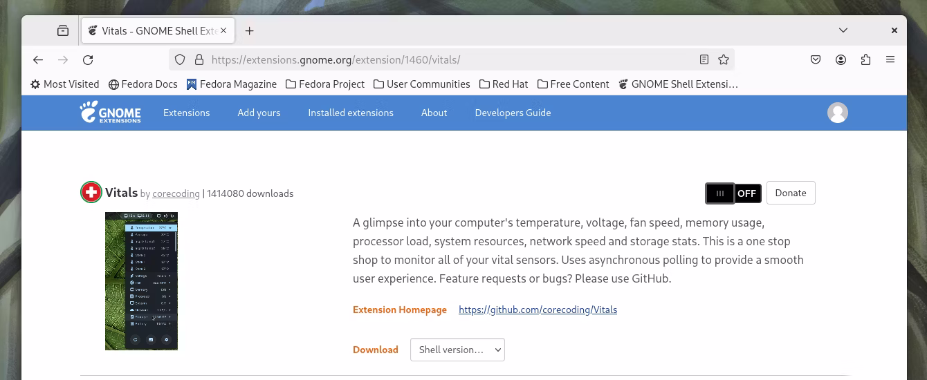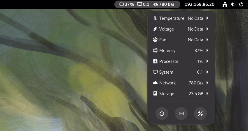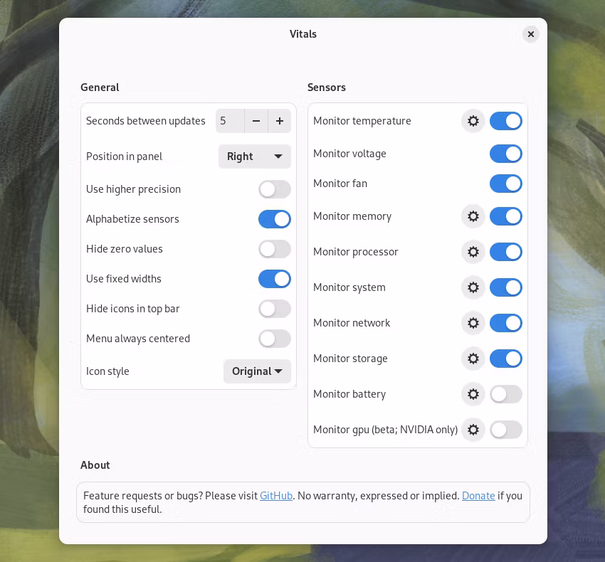 Vitals 扩展就像是 LAN IP 地址的增强版。它在顶部栏上显示有关您计算机的多项信息,并且是可配置的。您可以通过搜索“Vitals”在 GNOME 扩展网站上找到它。