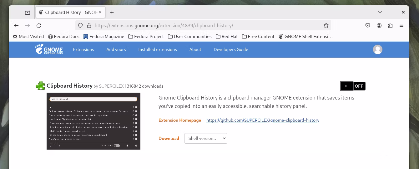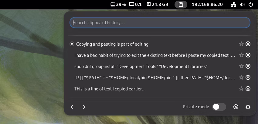这就是剪贴板历史的亮点。它存储复制文本的所有剪辑,以便我可以从方便的菜单中选择它们。您可以通过搜索“剪贴板历史记录”在 GNOME 扩展网站上找到它。