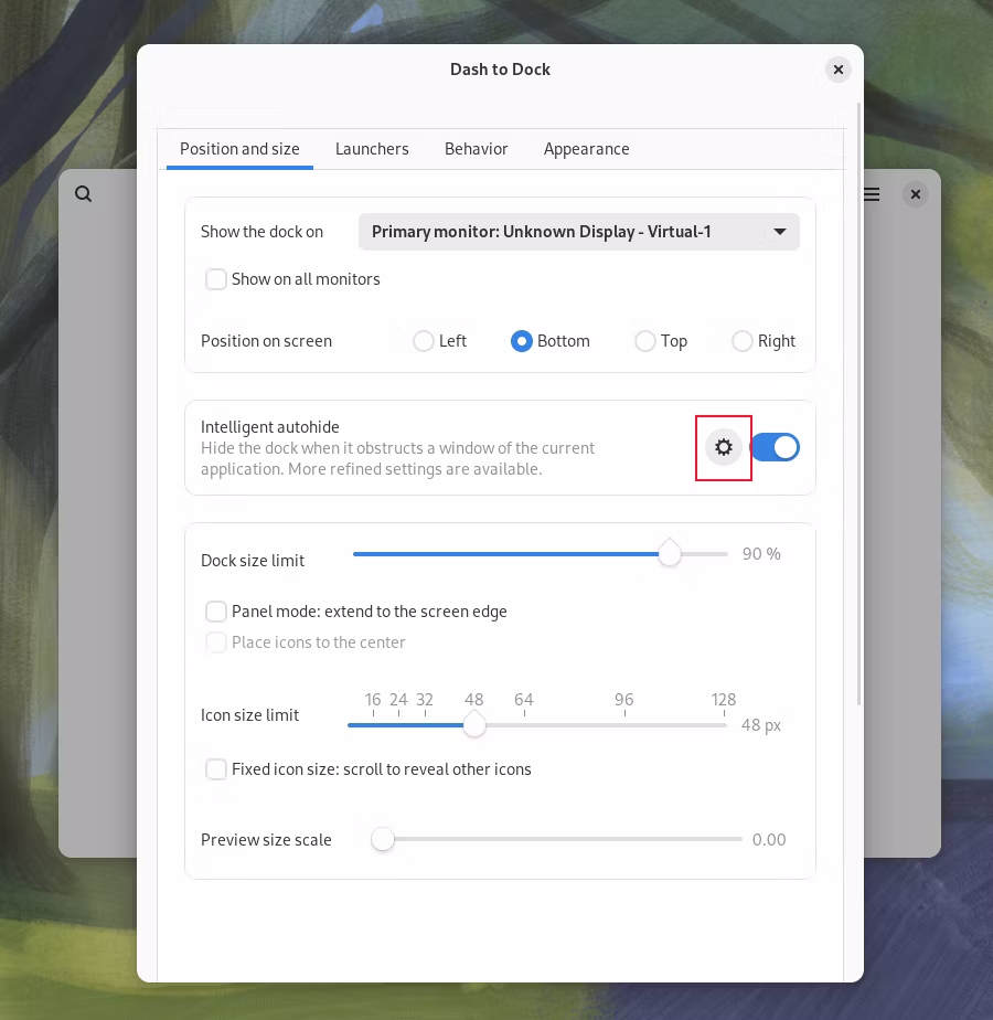 您将看到“智能自动隐藏自定义”对话框。我不想看到扩展坞,除非我要使用它,所以我关闭了 Dodge Windows 滑块。
