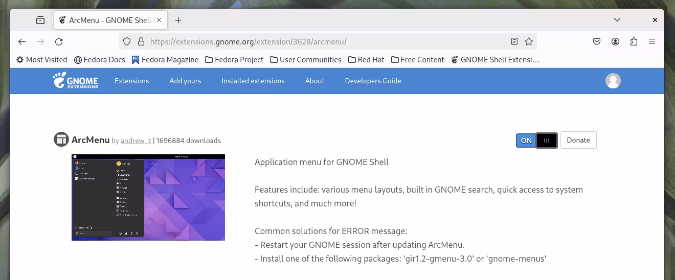 您可以通过搜索“ArcMenu”在 GNOME 扩展网站上找到它。安装后,工作区指示器将替换为一个小图标。