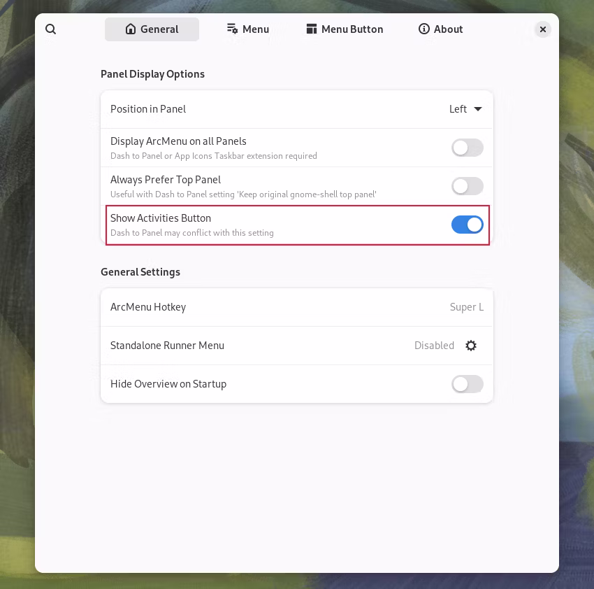 单击 ArcMenu 设置图标可打开设置对话框。有很多选择。这是修补匠的乐趣。甚至还有一个名为“显示活动按钮”的选项,如果您错过了它,它可以恢复工作场所指示器。