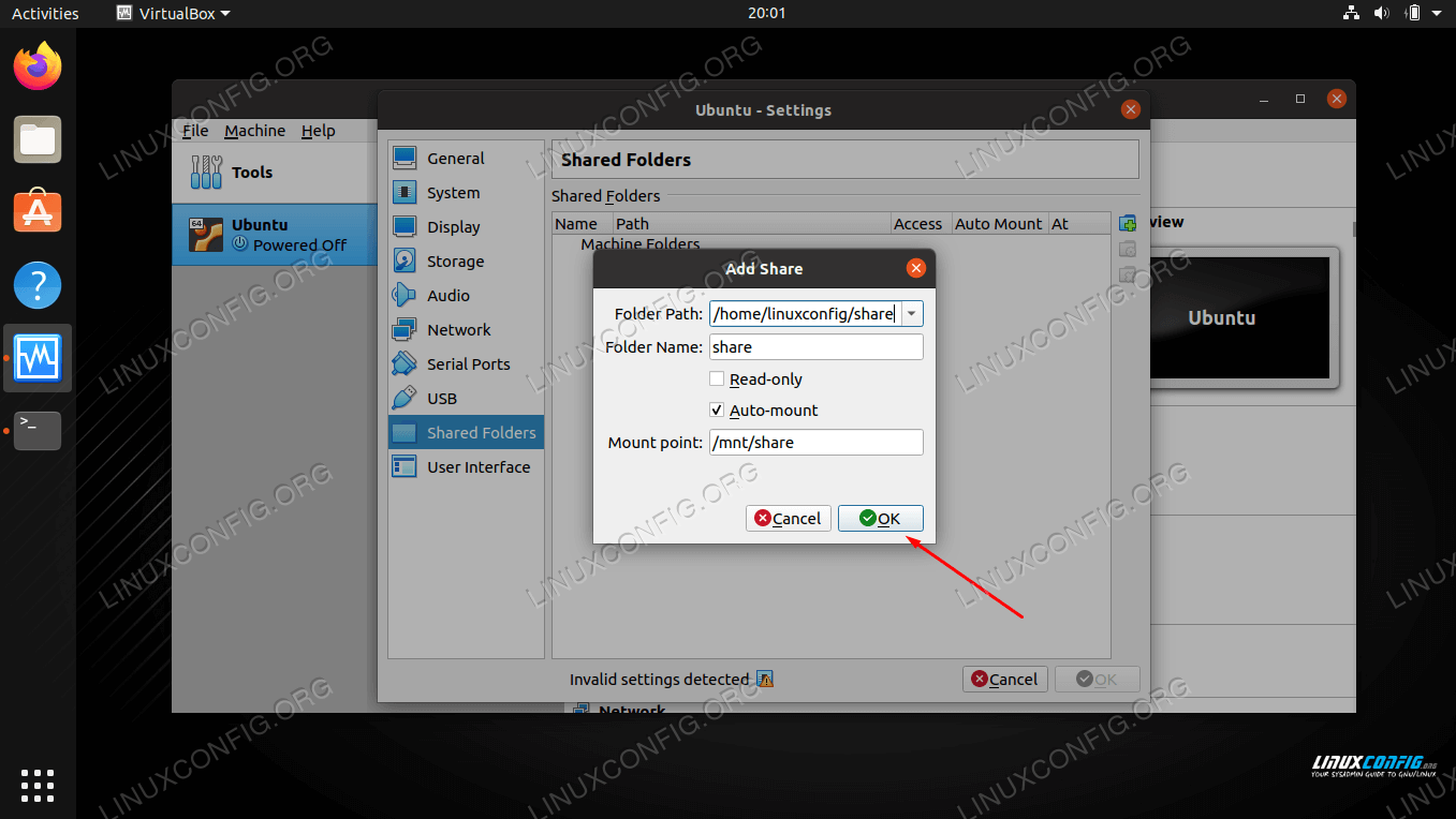 保存这些设置后,启动进入虚拟机。您应该发现您的共享已直接自动挂载,并且您现在可以与主机操作系统共享文件。如果您没有选择自动挂载选项,我们将向您展示如何手动挂载 VirtualBox 共享。打开终端并创建一个要在其中安装 VirtualBox 共享文件夹的目录。例如,如果我们想将 VirtualBox 共享文件夹挂载到 /home/linuxconfig/share 中,我们需要首先创建这个目录。
