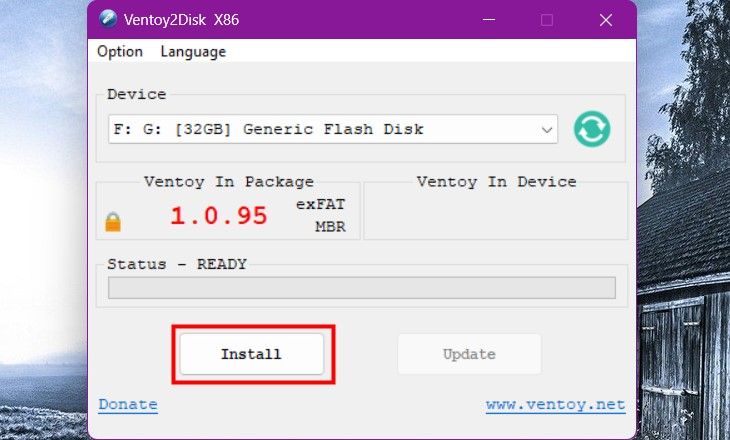 这也意味着 Ventoy 的界面比 Rufus 或 balenaEtcher 中的界面更简单。由于您只需要选择目标磁盘,因此只有一个列出磁盘的下拉菜单和一个“安装”按钮(如果程序在所选驱动器中检测到 Ventoy 安装,则为“更新”按钮)。