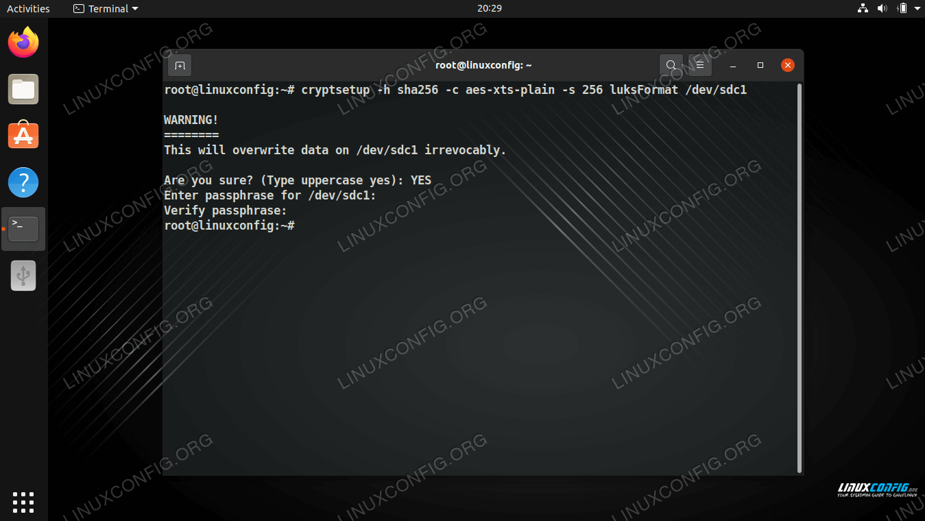 # cryptsetup -h sha256 -c aes-xts-plain -s 256 luksFormat /dev/sdX1