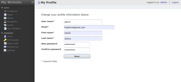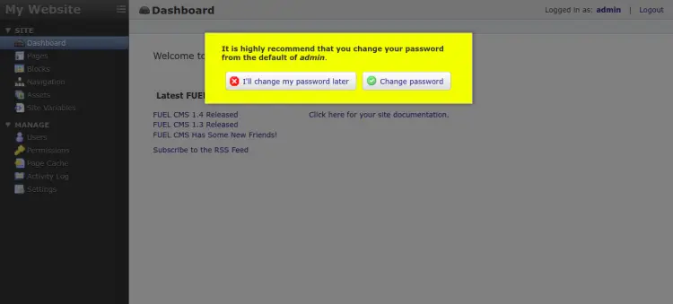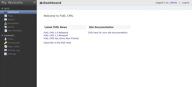 提供您的新密码,然后单击“保存”按钮以保存更改。现在,单击仪表板按钮。您应该在以下页面上看到 Fuel CMS 仪表板: