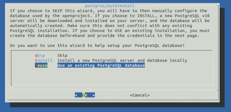 单击使用现有的 PostgreSQL 数据库,然后按Enter键。系统会要求您提供 PostgreSQL 主机:
