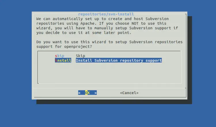 选择安装 Subversion 存储库支持并按Enter键。系统将要求您定义存储库路径: