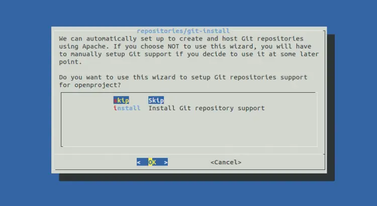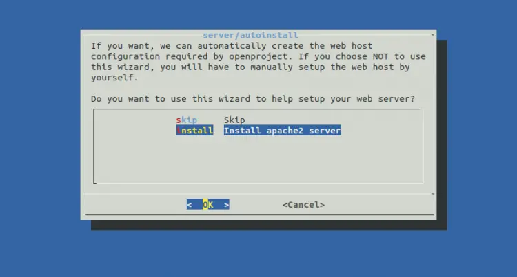 选择跳过并按Enter键开始配置。配置 OpenProject 后,使用以下命令验证 Apache 服务: