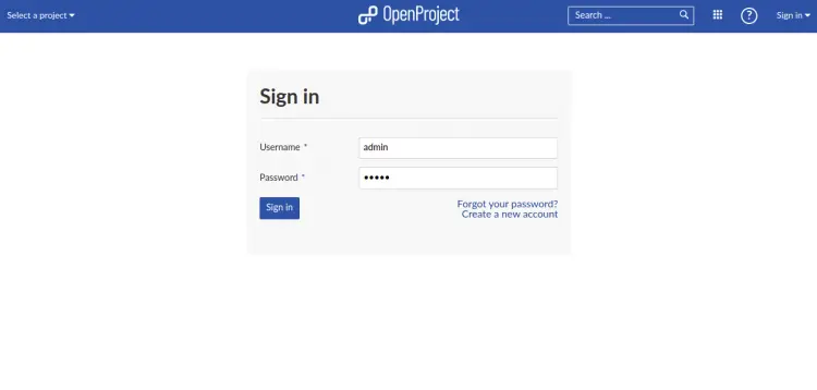现在,打开 Web 浏览器并使用 URL http://openproject.example.com/login 访问 OpenProject。您将被重定向到 OpenProject 登录页面: