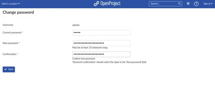 设置新的管理员密码,然后单击保存按钮应用更改。您应该在以下屏幕上看到 OpenProject 仪表板: