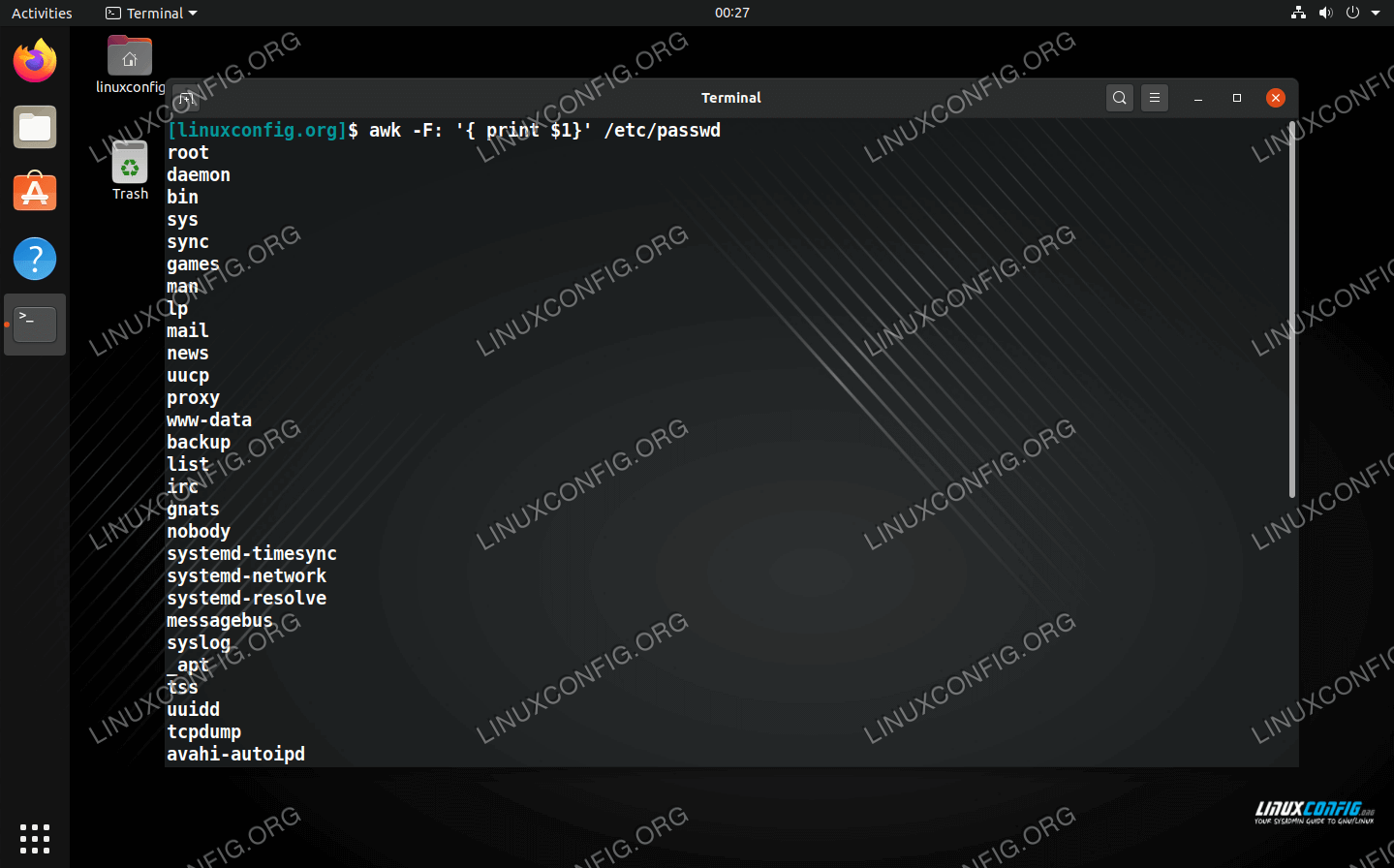 由于如果我们只需要用户名,则此输出太多,因此我们可以使用 awk 命令仅显示帐户的用户名。