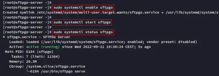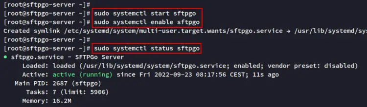 接下来,运行下面的 systemctl 命令来启动并启用 sFTPGo 服务。该服务应该正在运行,并且将在系统启动期间自动执行。