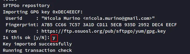 此外,如果您收到接受 sFTPGo 存储库的 GPG 密钥的提示,请再次输入 y。