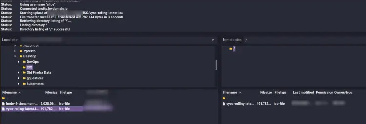 通过 SFTP 协议连接后,您可以尝试将文件上传到 sFTPGo 服务器。下面的示例显示 ISO 文件通过 FileZilla 客户端上传到 sFTPGo 服务器。