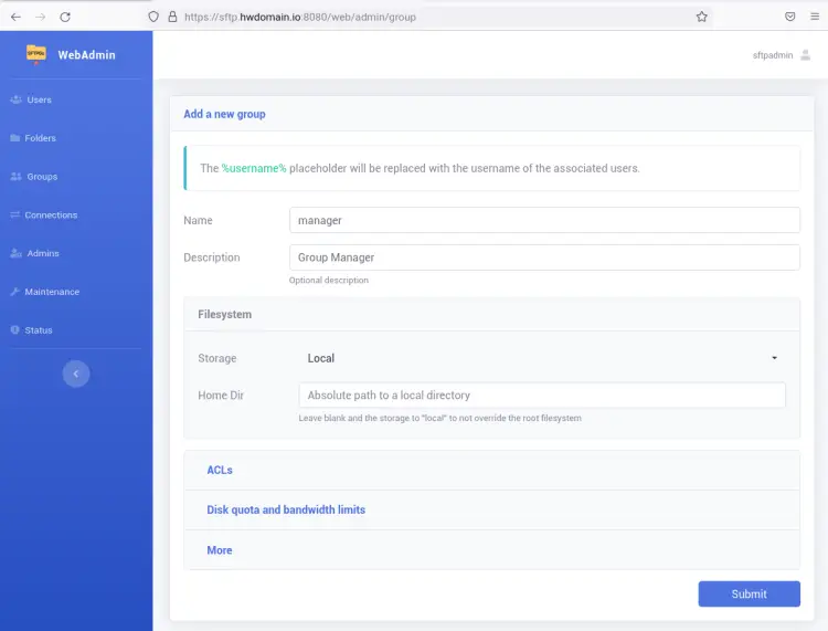 点击左侧的“群组”菜单,然后输入新的群组名称和描述,然后点击“提交”。在此示例中,您将创建一个新群组名为“manager”的组,您还可以添加其他配置,例如 ACL(访问控制列表)并为每个组设置特定的磁盘配额和带宽。