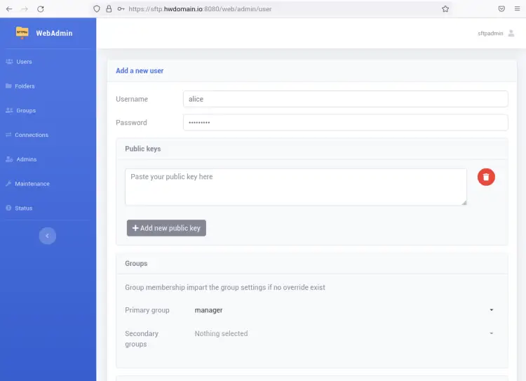 打开网络浏览器并访问 sFTPGo 安装的 URL 域名(即:https://sftp.hwdomain.io"8080/)。