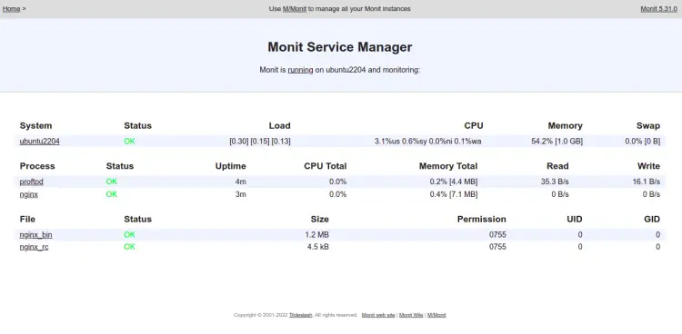 恭喜!您已在Ubuntu 22.04上成功安装并配置Monit监控工具。您现在可以探索 Monit 功能、添加更多服务并通过 Web 浏览器监控它们。如果您有任何疑问,请随时问我。