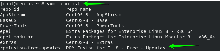 使用 repolist 命令,您可以看到 RPM Fusion 存储库现已安装在系统中。