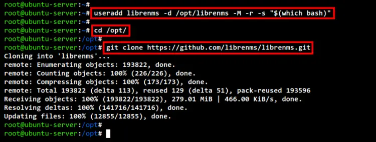 该命令将创建一个新用户“librenms”,其主目录为 /opt./librenms 和默认 shell bash。