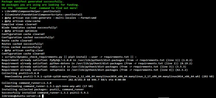 下面是 LibreNMS 安装完成时的屏幕截图。如您所见,安装程序脚本将从 PyPi 存储库安装一些附加的 Python 工具。