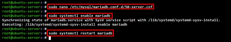 接下来,运行以下 systemctl 命令以启用并重新启动 MariaDB 服务。这将使 MariaDB 服务能够在系统启动时启动,并将新的更改应用于 MariaDB 服务器配置。
