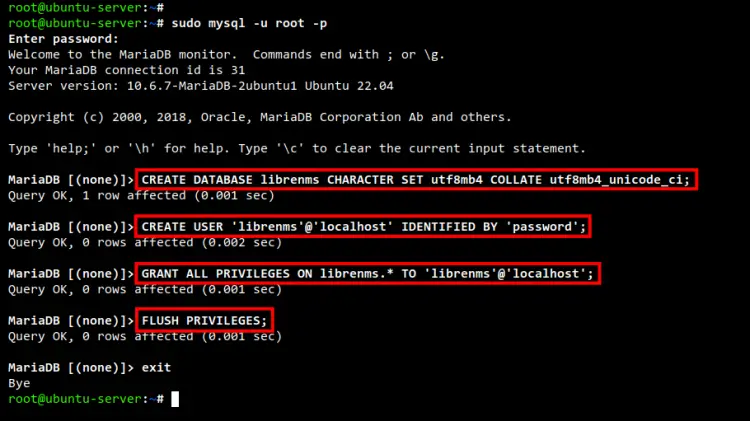 最后,输入 exit 从 MariaDB shell 注销。现在您必须为 LibreNMS 监控工具创建数据库和用户。