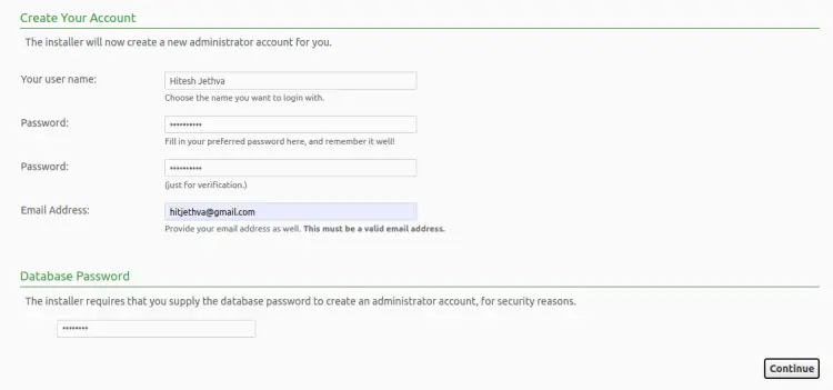 单击继续按钮。您应该看到管理员帐户创建页面: