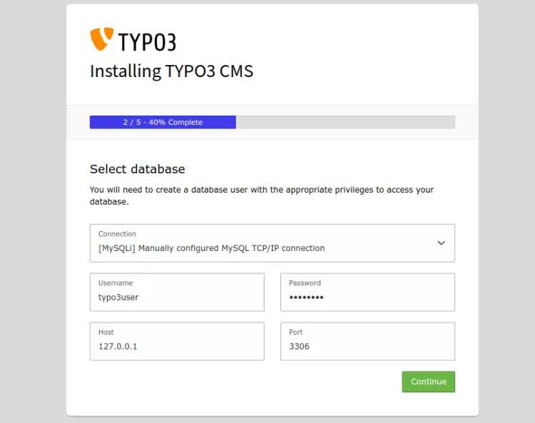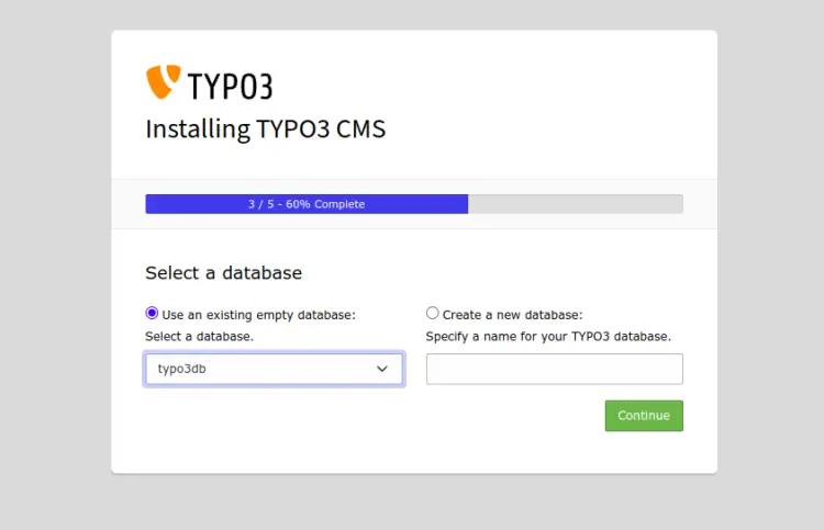 选择您的 TYPO3 数据库名称,然后单击继续按钮。您应该看到以下页面: