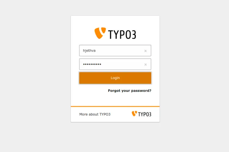 接下来,提供您的管理员用户名、密码、站点名称,然后单击继续按钮。您将被重定向到 TYPO3 登录页面:
