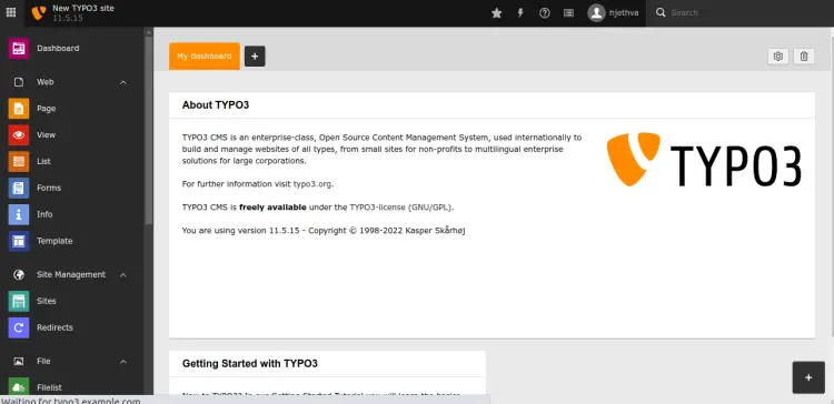提供您的管理员用户名、密码,然后单击登录按钮。您应该在以下页面上看到 TYPO3 仪表板: