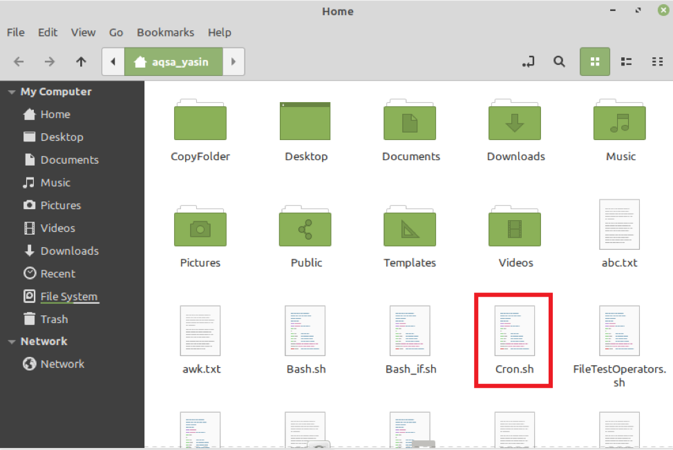 为了演示“find”命令,我们将尝试在主目录中查找名为“Cron.sh”的文件。