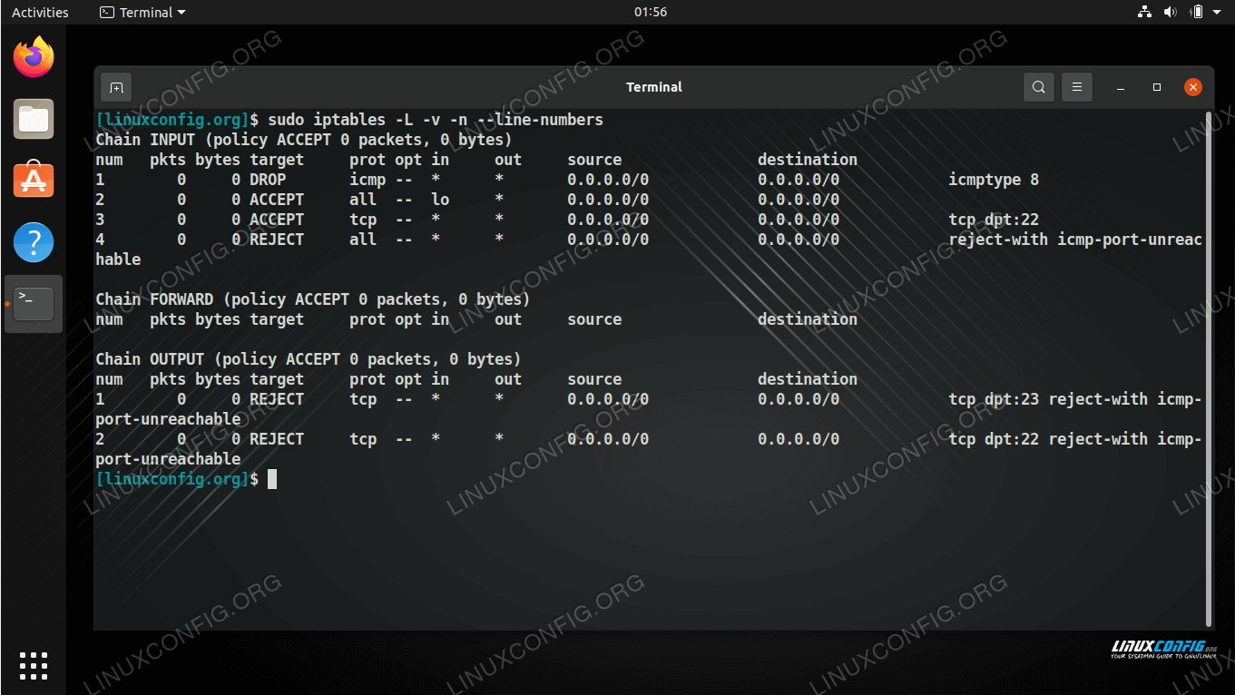 请注意 iptables 规则的顺序很重要。当您的系统收到网络流量数据包时,iptables 会将其与它可以匹配的第一条规则进行匹配。因此,如果您有一条接受 SSH 流量的规则,后跟一条拒绝 SSH 流量的规则,则 iptables 将始终接受该流量,因为该规则位于链中的拒绝规则之前。您始终可以通过在命令中指定规则编号来更改规则顺序。