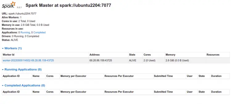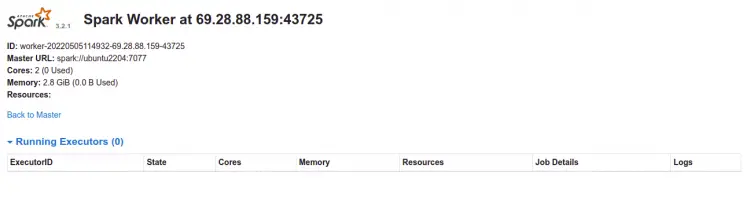 现在,返回 Spark Web 界面并刷新网页。您应该在以下页面上看到添加的 Worker: